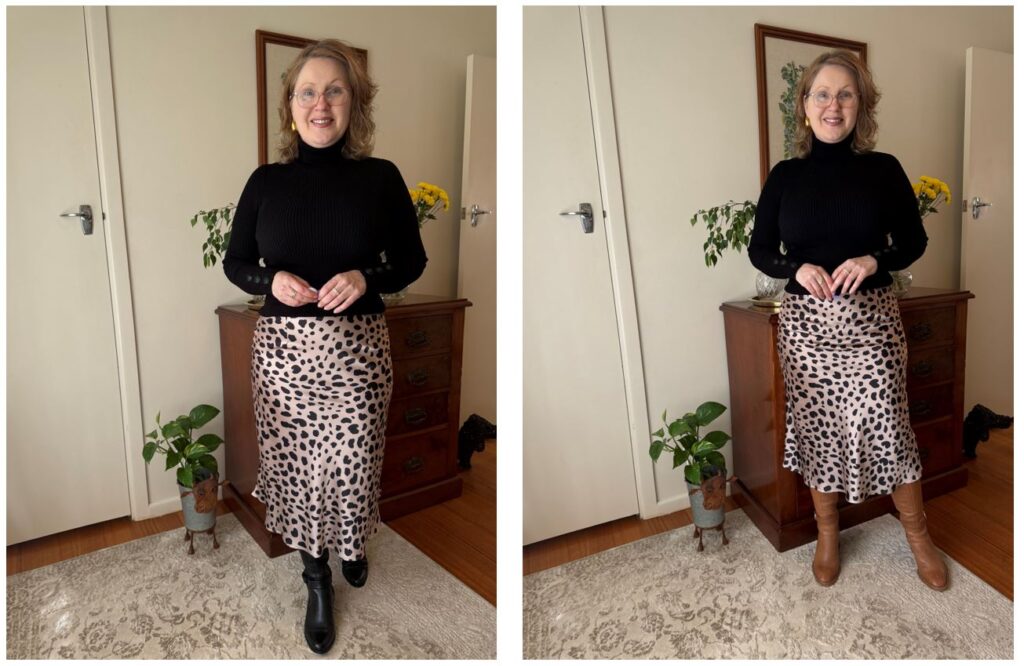 When choosing your animal print skirt, consider the size and colour of the print, the fabric, and the silhouette.