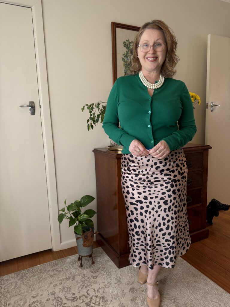 Green cardigan + animal print skirt + neutral shoes + pearl necklace.